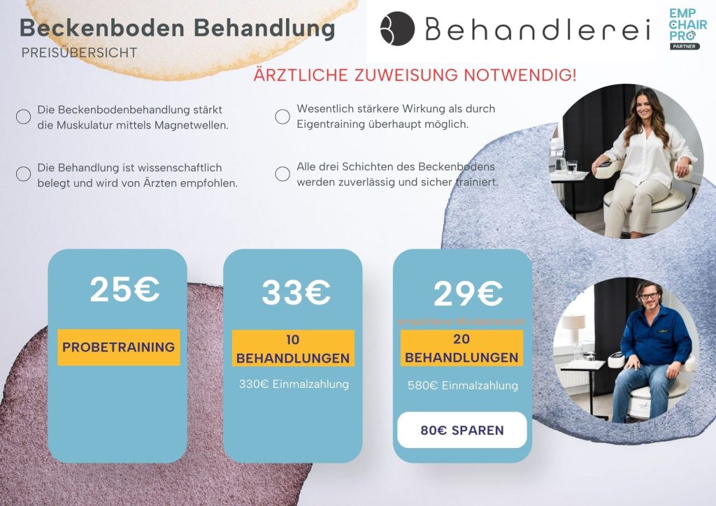 Die Stimulation kräftigt zuverlässig die Beckenbodenmuskulatur, sodass die Organe wieder unterstützt werden können. Durch den gezielten Muskelaufbau werden die Symptome einer Beckenbodenschwäche gelindert. Viele spüren bereits nach der ersten Sitzung das erste Mal ihre Beckenbodenmuskulatur. Nach 6 – 10 Sitzungen sind die ersten Erfolge deutlich spürbar. Mit jeder Sitzung werden sich die Erfolge weiter verbessern.
